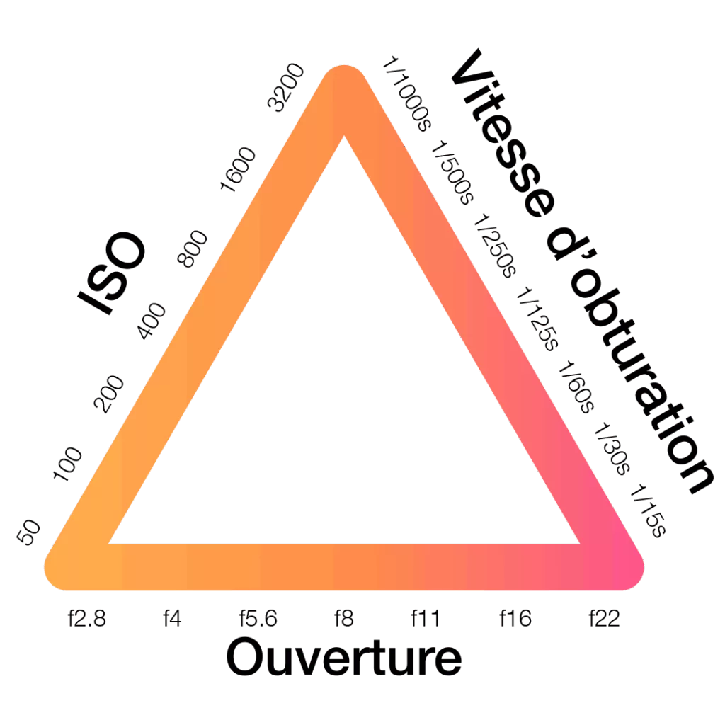L’ouverture (aperture), la sensibilité ISO, et la vitesse d’obturation (shutter speed).