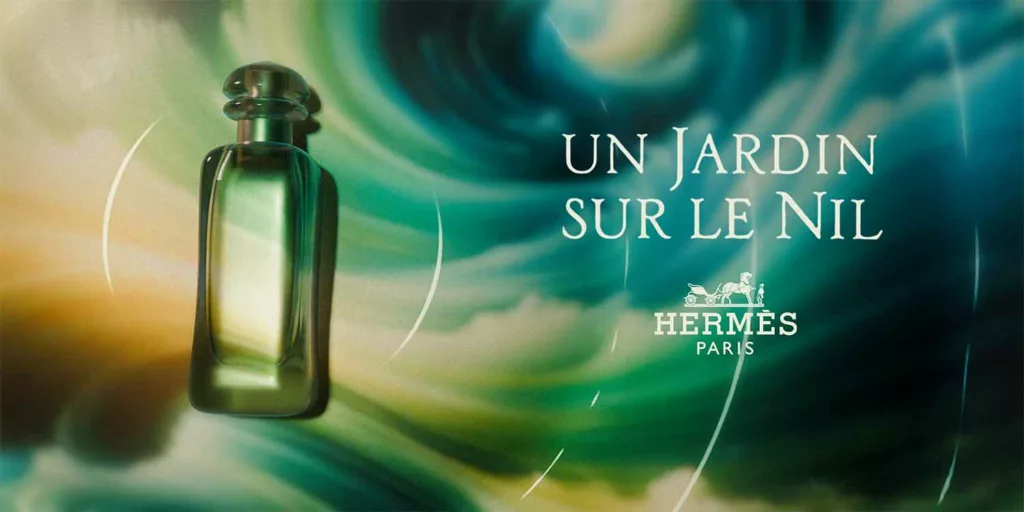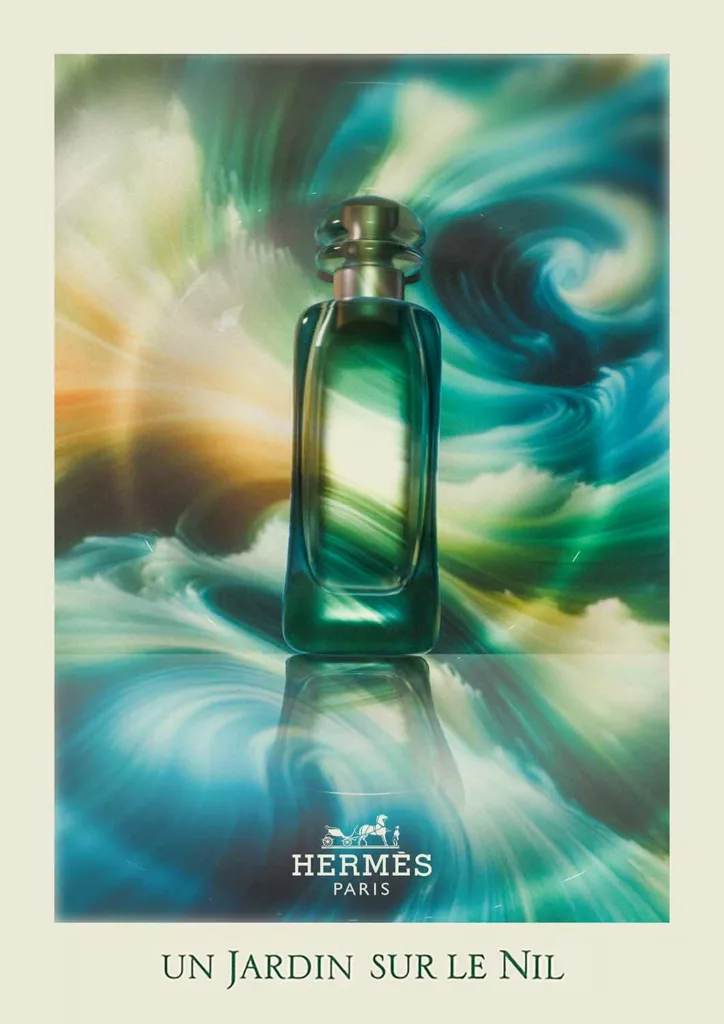Une image abstraite représentant l’essence du parfum est générée par intelligence artificielle avant d’être projetée sur le flacon modélisé en 3D. Le rendu obtenu est ajusté et transformé en affiche à l’aide d’un logiciel de retouche d’image